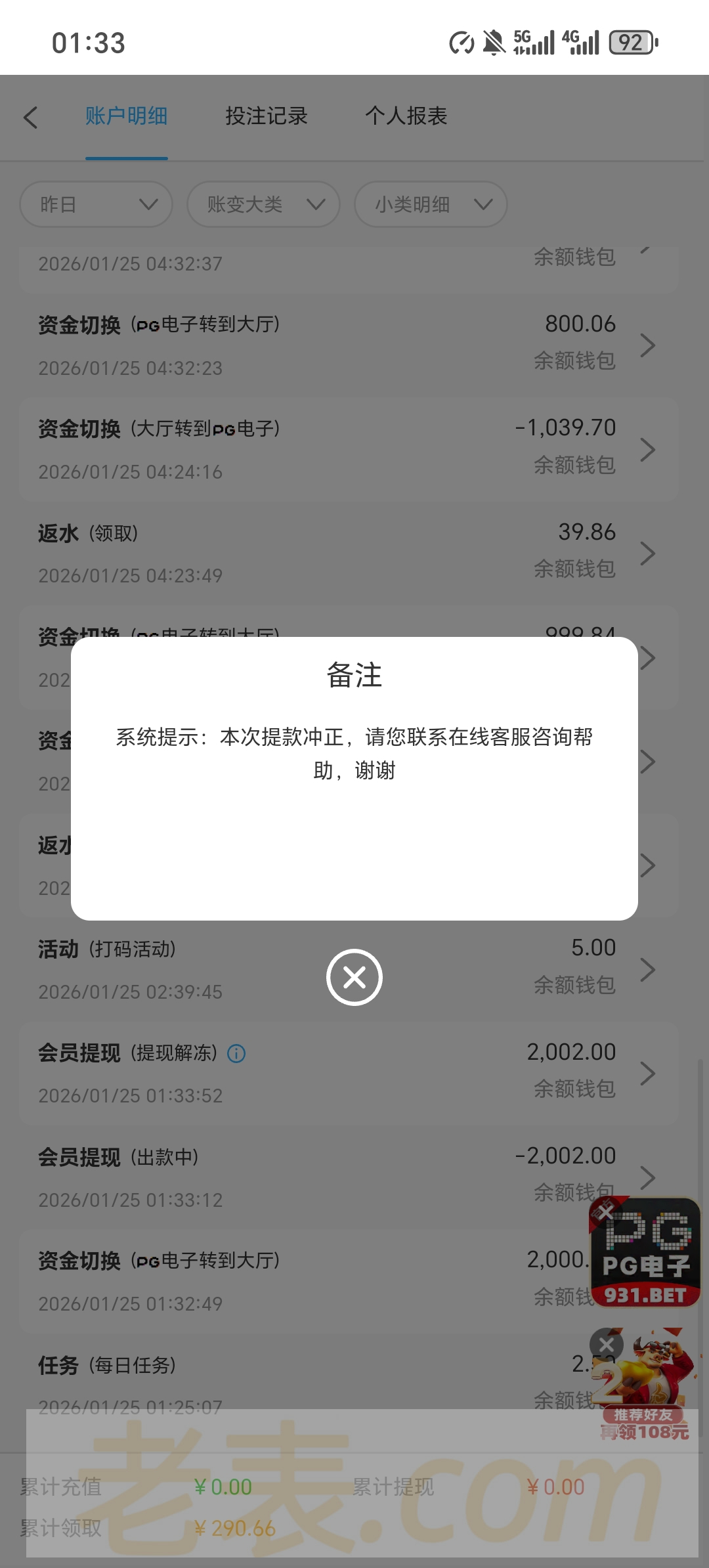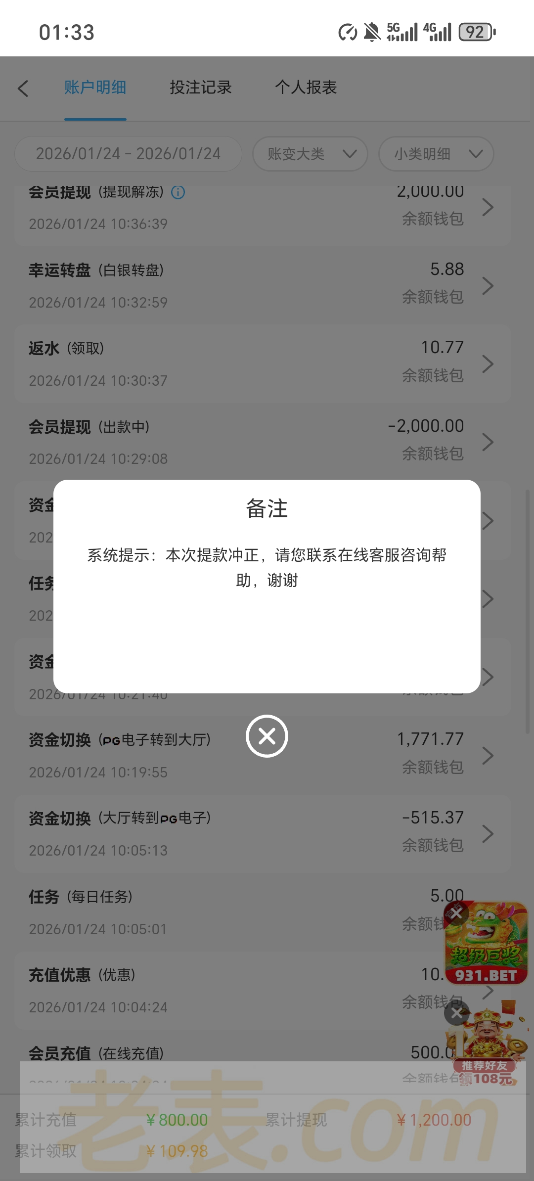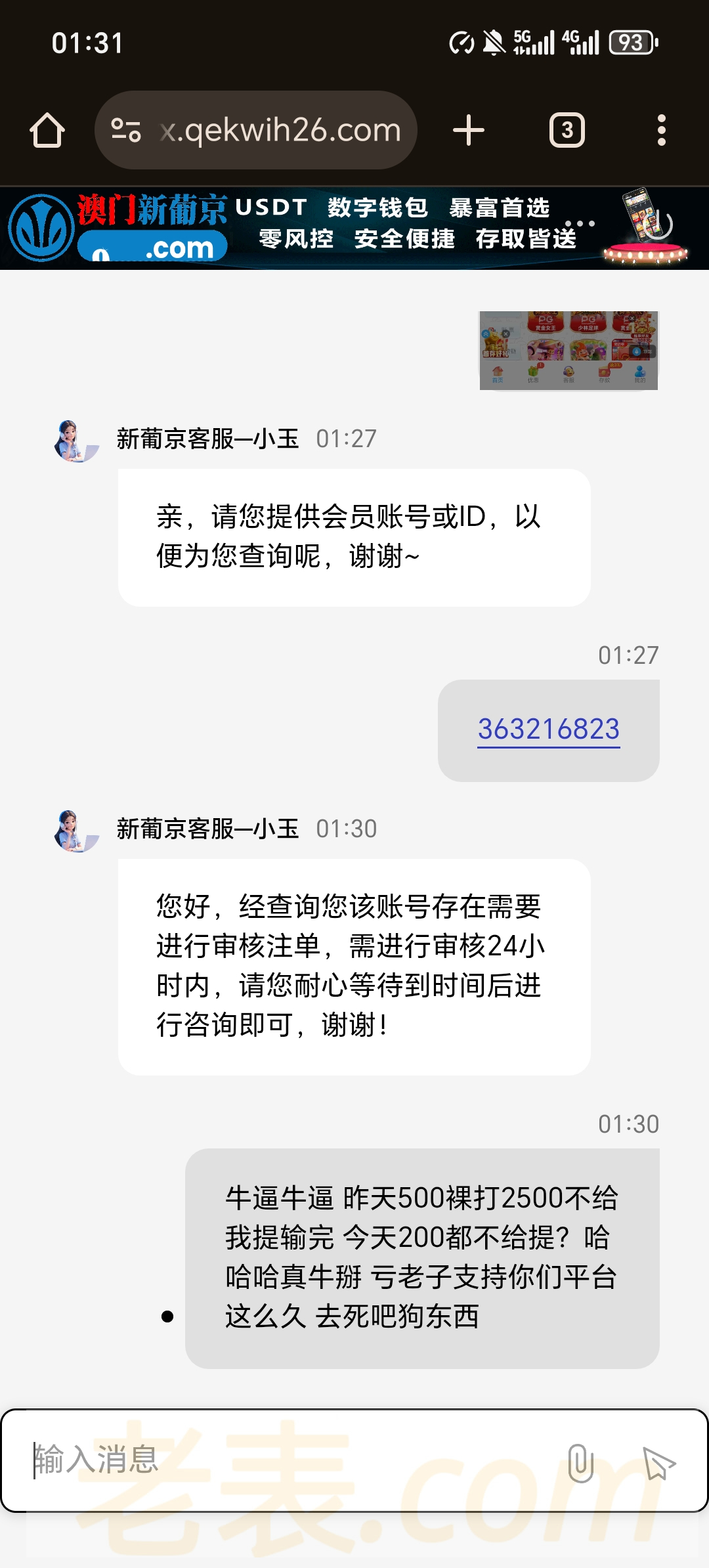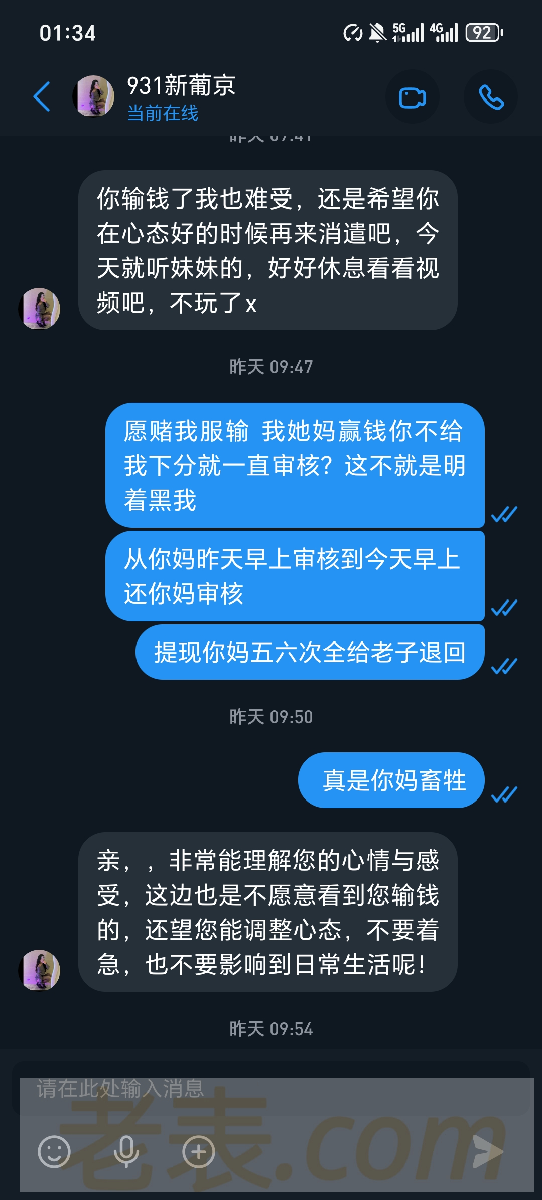 死妈931黑台上500裸打下2000卡两天 下了五六次 问就是注单异常审核中  输到剩500只下本金都不给下  输完今天活动送的几十下200都不给下 依旧注单异常审核 真鸡巴牛掰   这个台玩了两个月赢了差不多两万吧之前下分都是几分钟就到账  现在直接开黑一毛都不给下